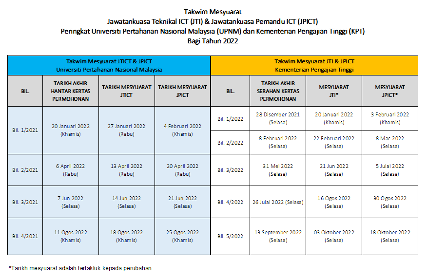 Cadangan Tarikh Mesyuarat JPICT Universiti Pertahanan Nasional Malaysia (UPNM) Bagi Tahun 2022